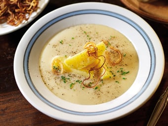 Schlagen Sie die Suppe direkt vor dem Servieren mit brauner Butter auf. Dazu passt sehr gut leichtes Knoblauchbrot.